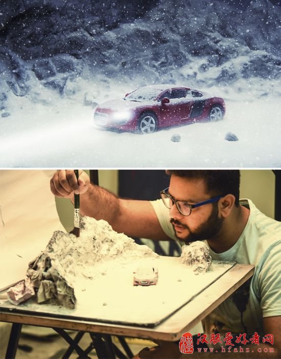 摄影师瓦茨尔·卡塔里亚表示,他不会使用昂贵的模型和装饰品,一切的布置都按最小的尺寸去做。他经常使用石膏来创建岩石和山区的景象;用报纸塑造“丘陵”;用聚苯乙烯板材和石膏的混合物打造漆黑道路的效果;用泡打粉打造“大雪纷飞”的场面,最后再使用PS增强画面的美感。瓦茨尔·卡塔里亚说,这一个创作过程十分简单,但却令人兴奋。他一般花费3到15天完成从构想到微观外景的搭建和拍摄。