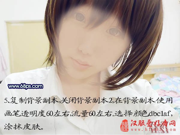 五、复制背景副本,关闭背景副本2,在背景副本,用透明度为:60%,流量为60%左右画笔涂抹皮肤,画笔颜色为:#dbc1af。