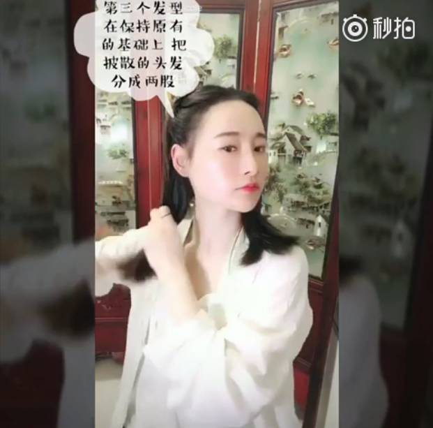 1、第三个发型在保持原有的基础上,把披散的头发分成两股