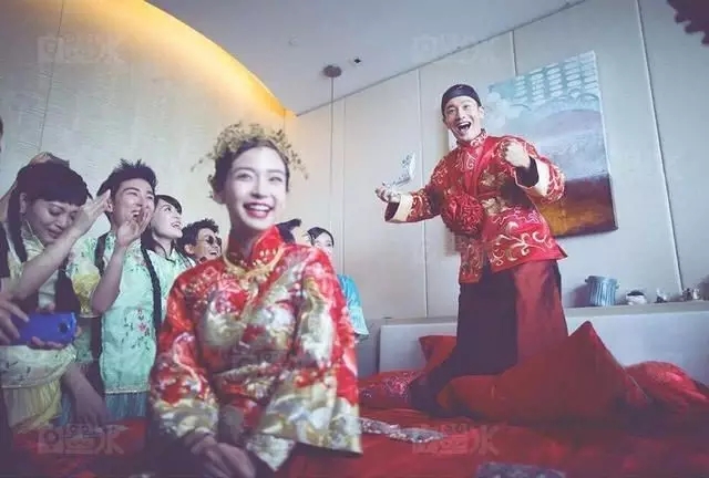 比如刘诗诗、陈妍希婚礼接亲环节都穿了龙凤褂,相应的吴奇隆、陈晓穿的也是定制的中式囍袍。